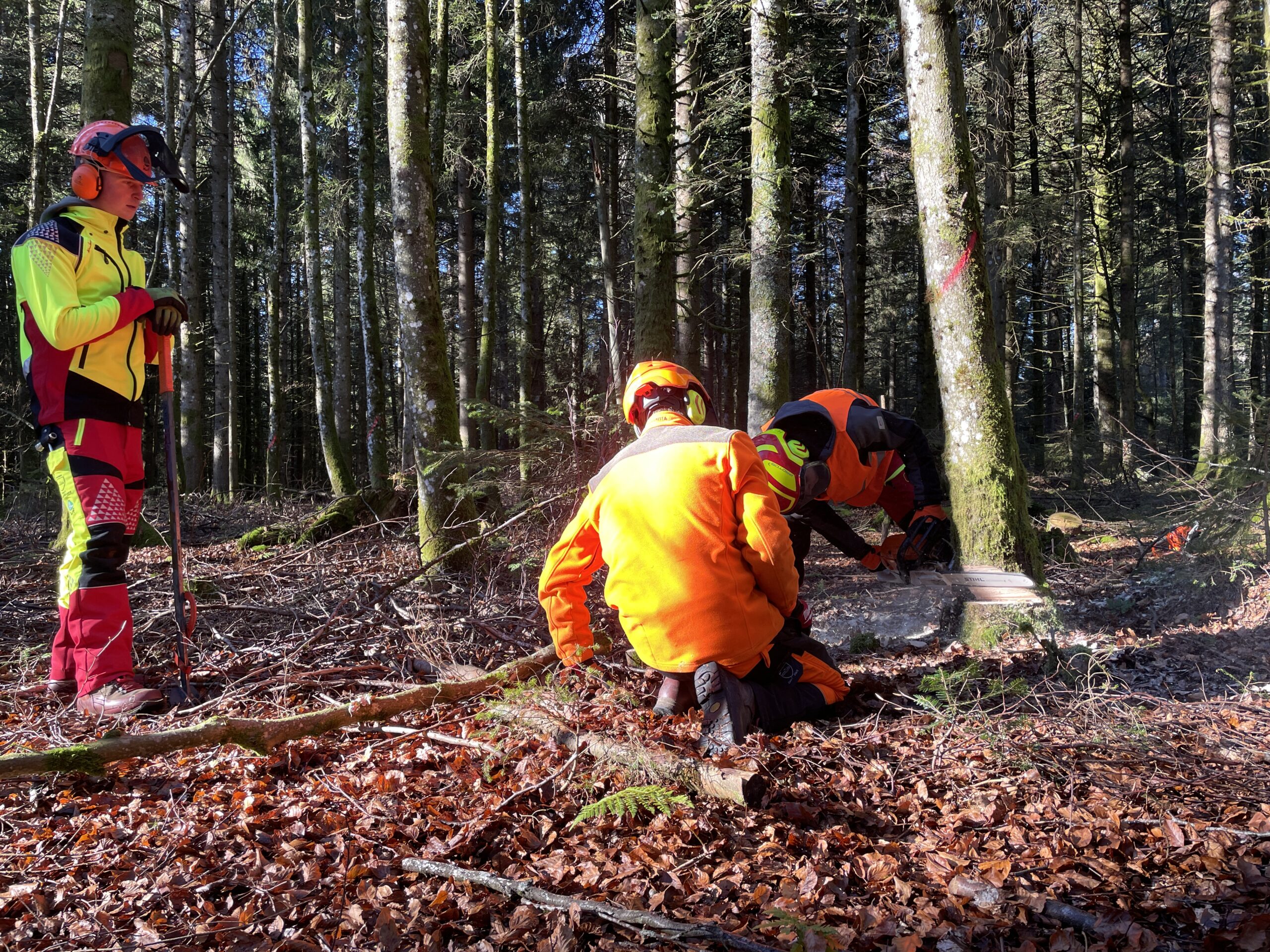 Am zweiten Tag wurden die am Vortag vermittelten Inhalte in zwei Gruppen in der Praxis angewendet. Dafür wurden im Staatswald Bäume gefällt und aufgearbeitet. Die Teilnehmer der Fortbildung konnten dabei verschiedene Schnitt- und Fälltechniken anwenden, das Ganze unter den aufmerksamen Blicken der beiden Ausbilder des ForstBW-Stützpunktes St. Peter.