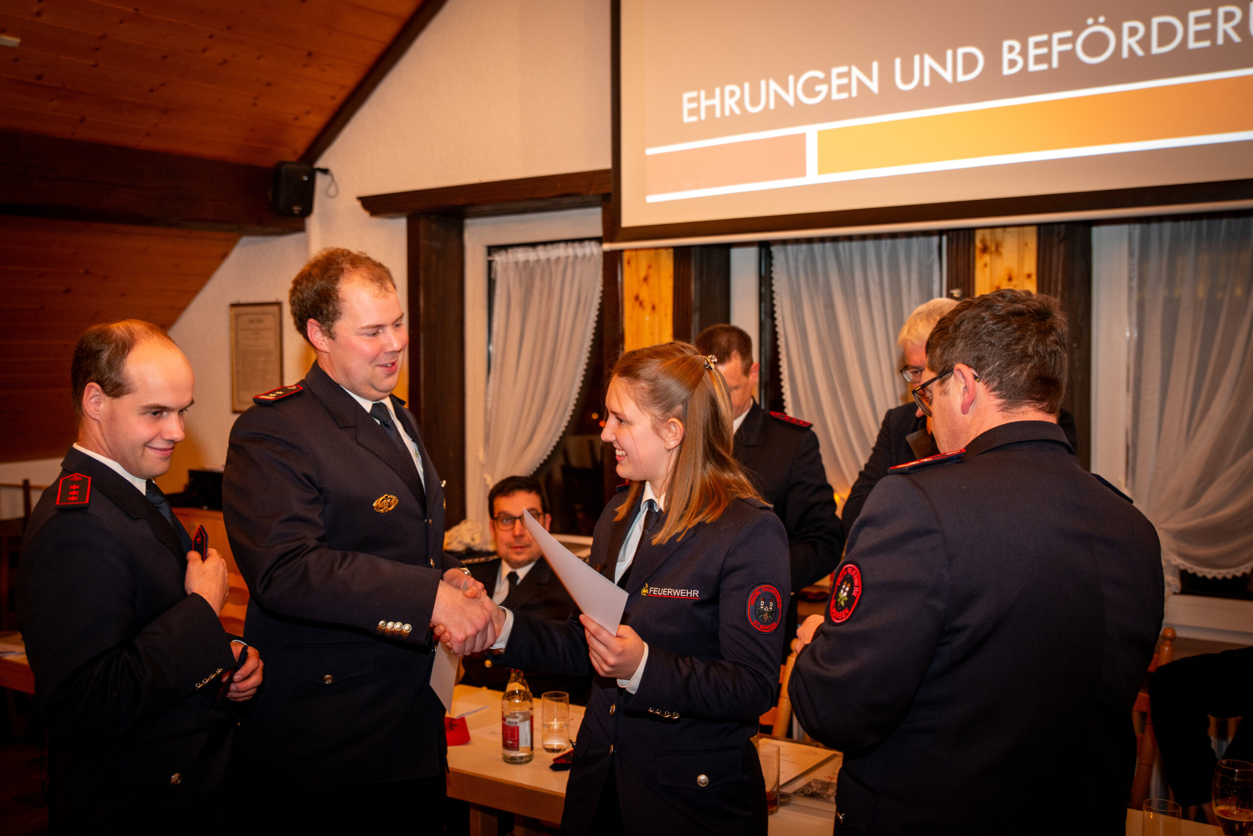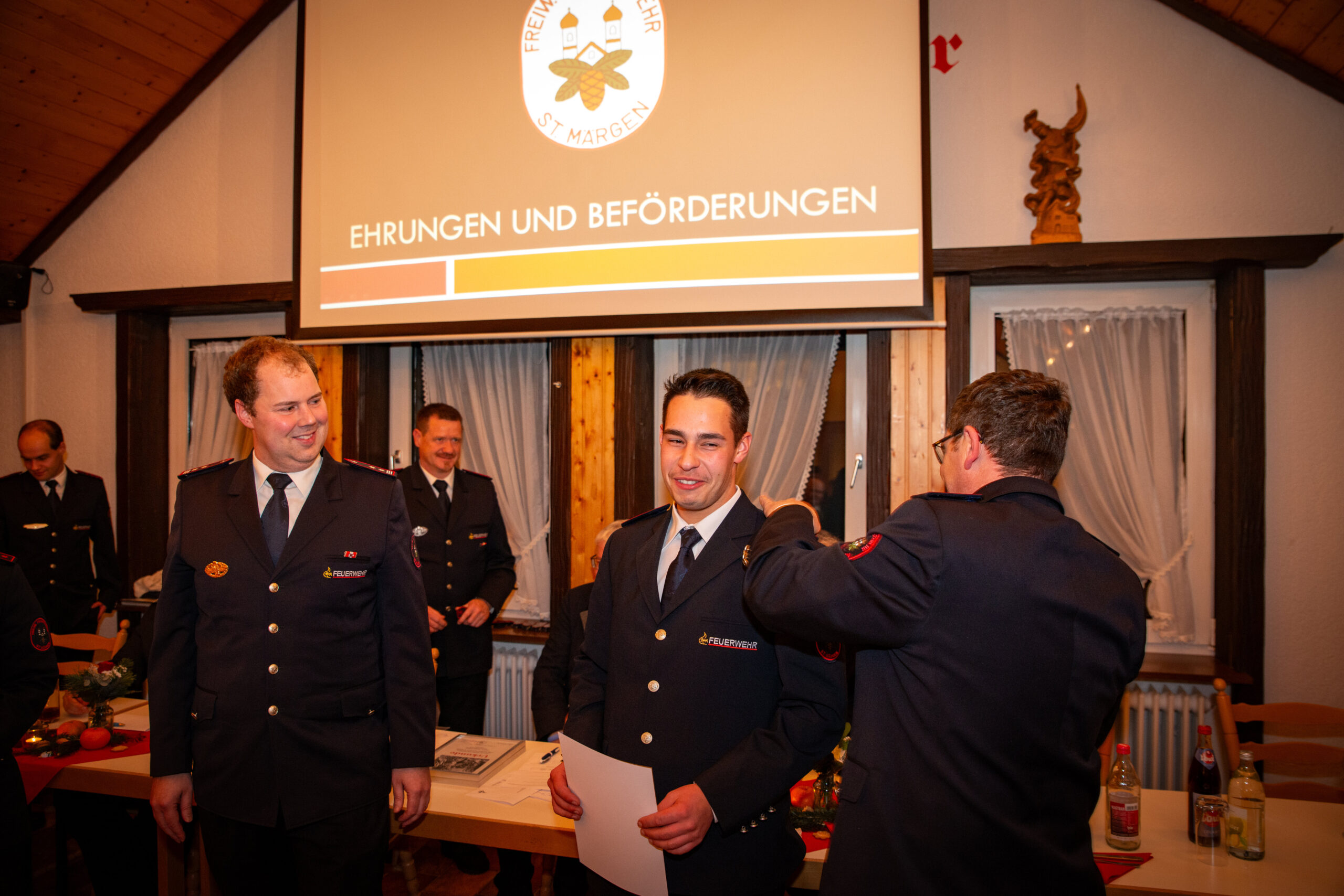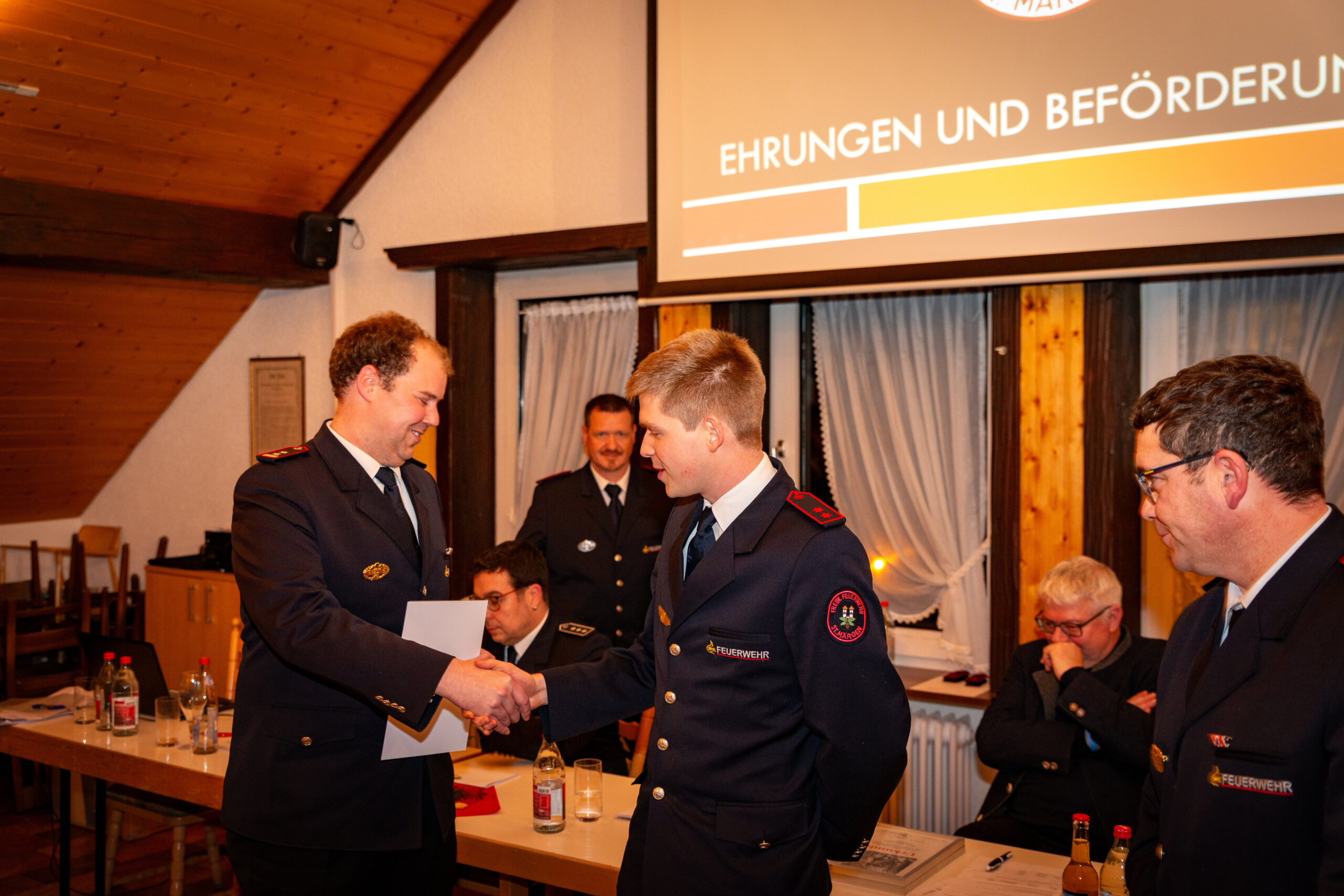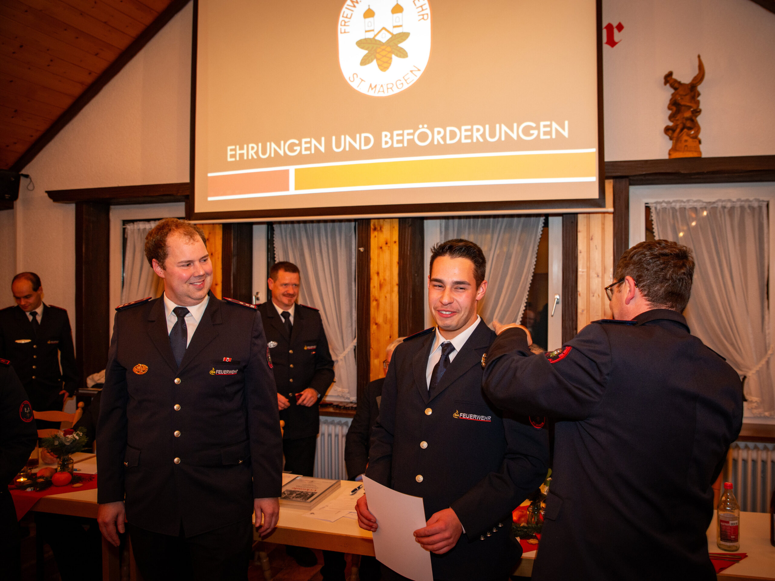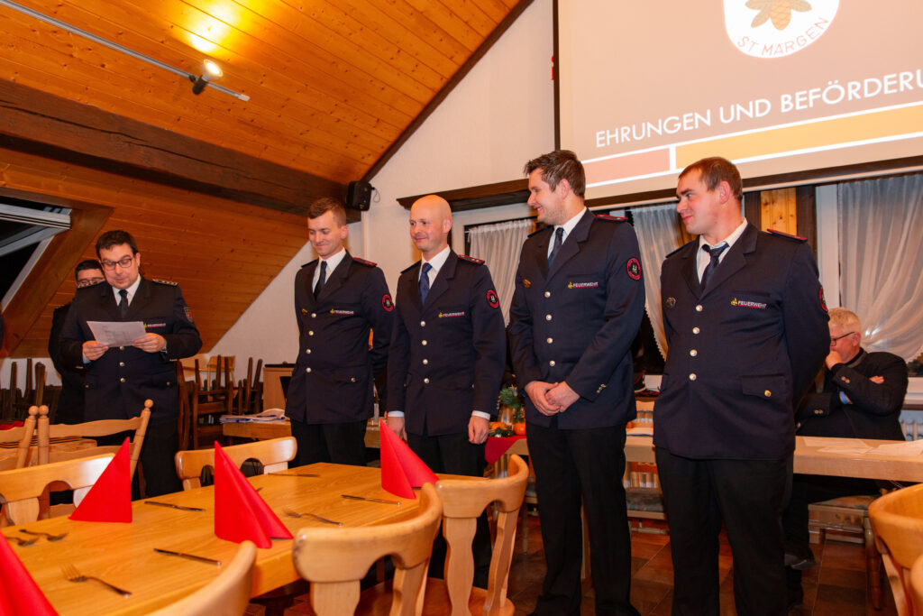 Befördert wurde Florian Simon zum Löschmeister. Zum/Zur Oberfeuerwehrmann/-frau befördert wurden Cora Schuler, Simon Wehrle und Robert Wehrle. Weiter wurden Benjamin Hog und Leonie Schuler zum/zur Feuerwehrmann/-frau befördert.