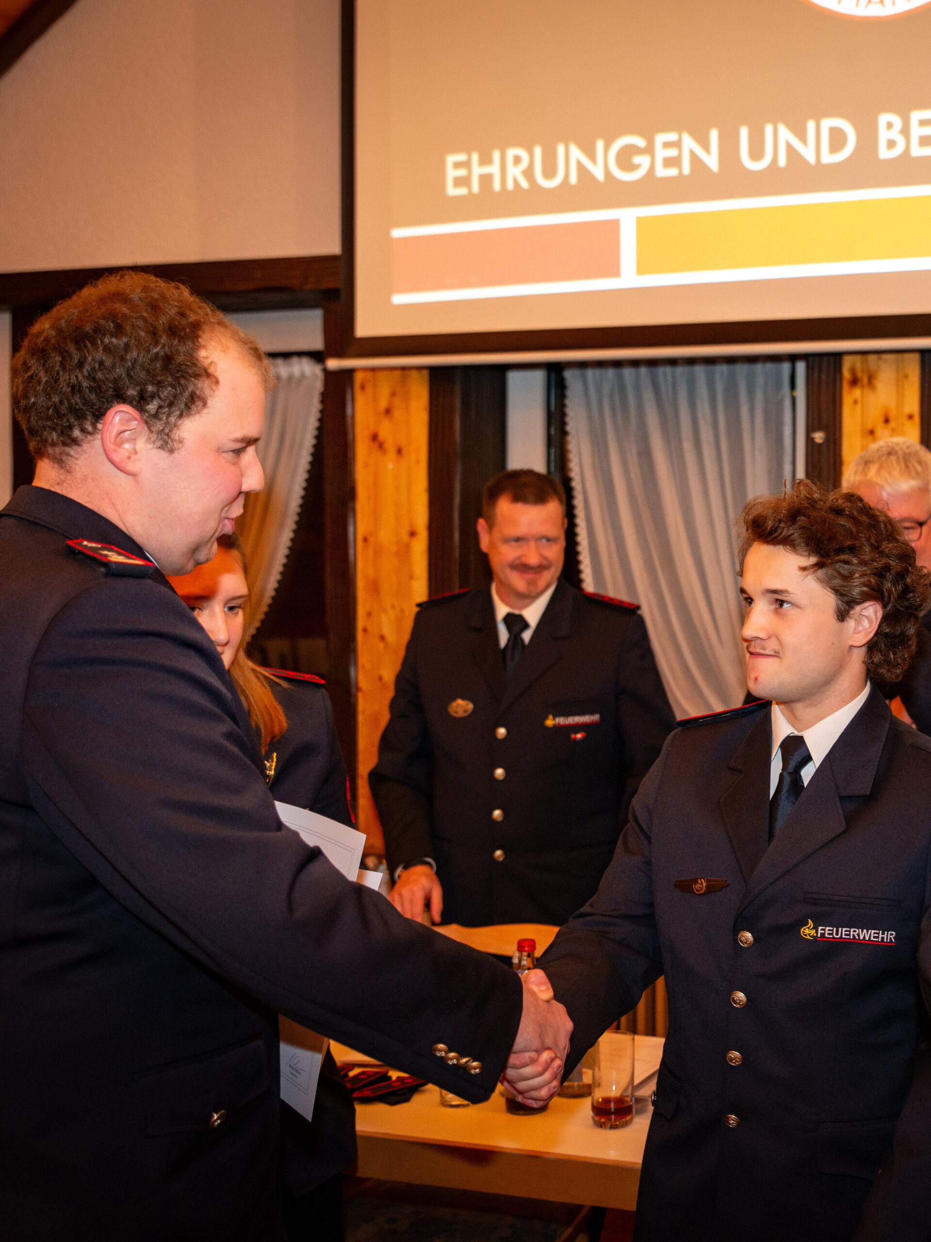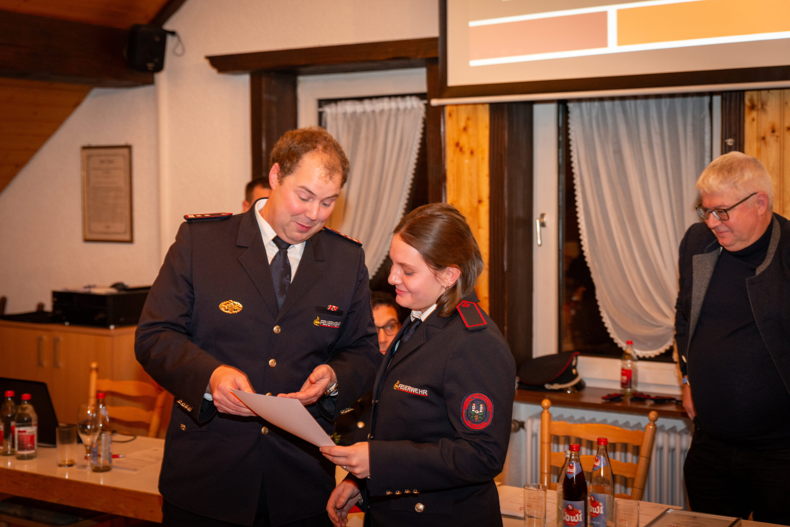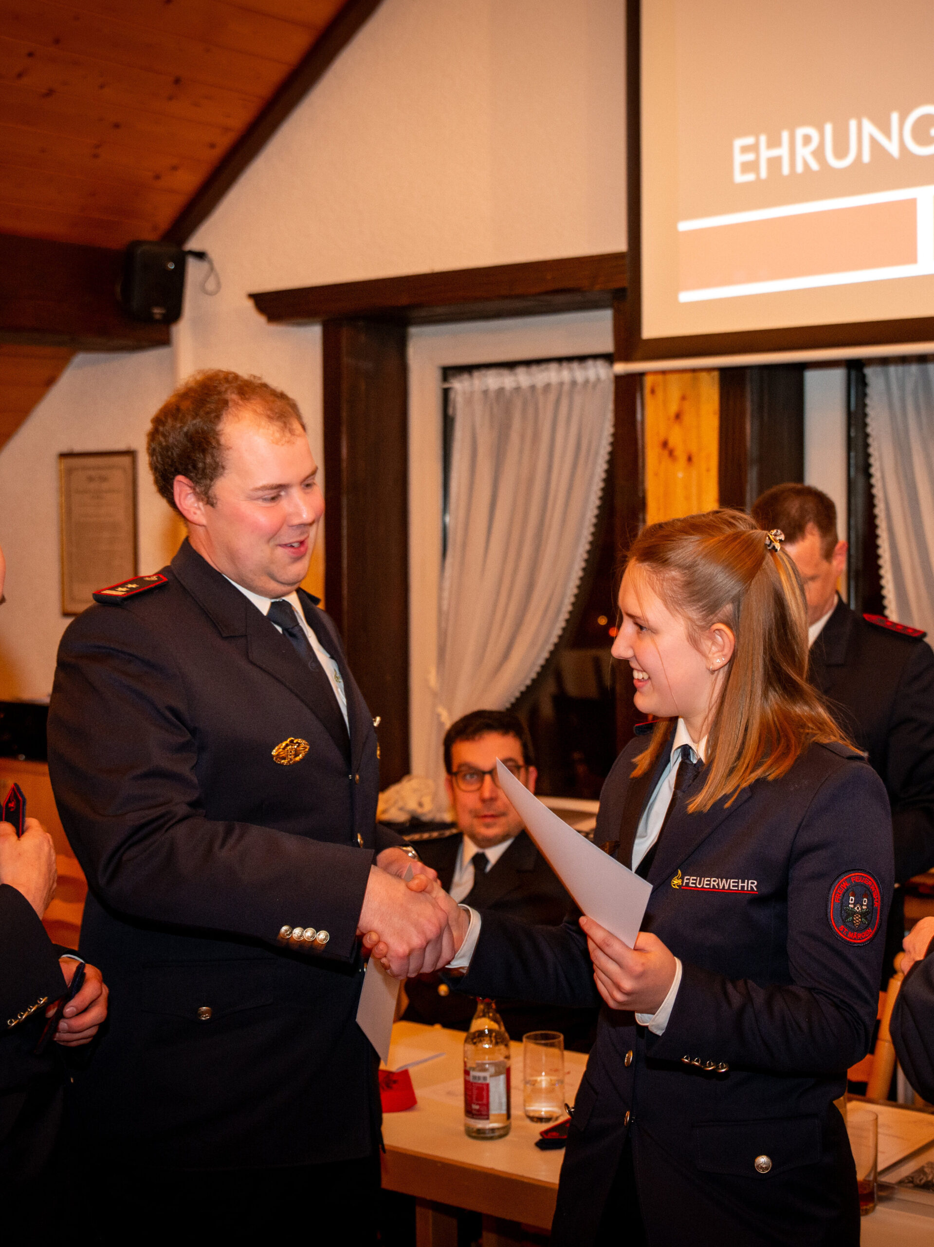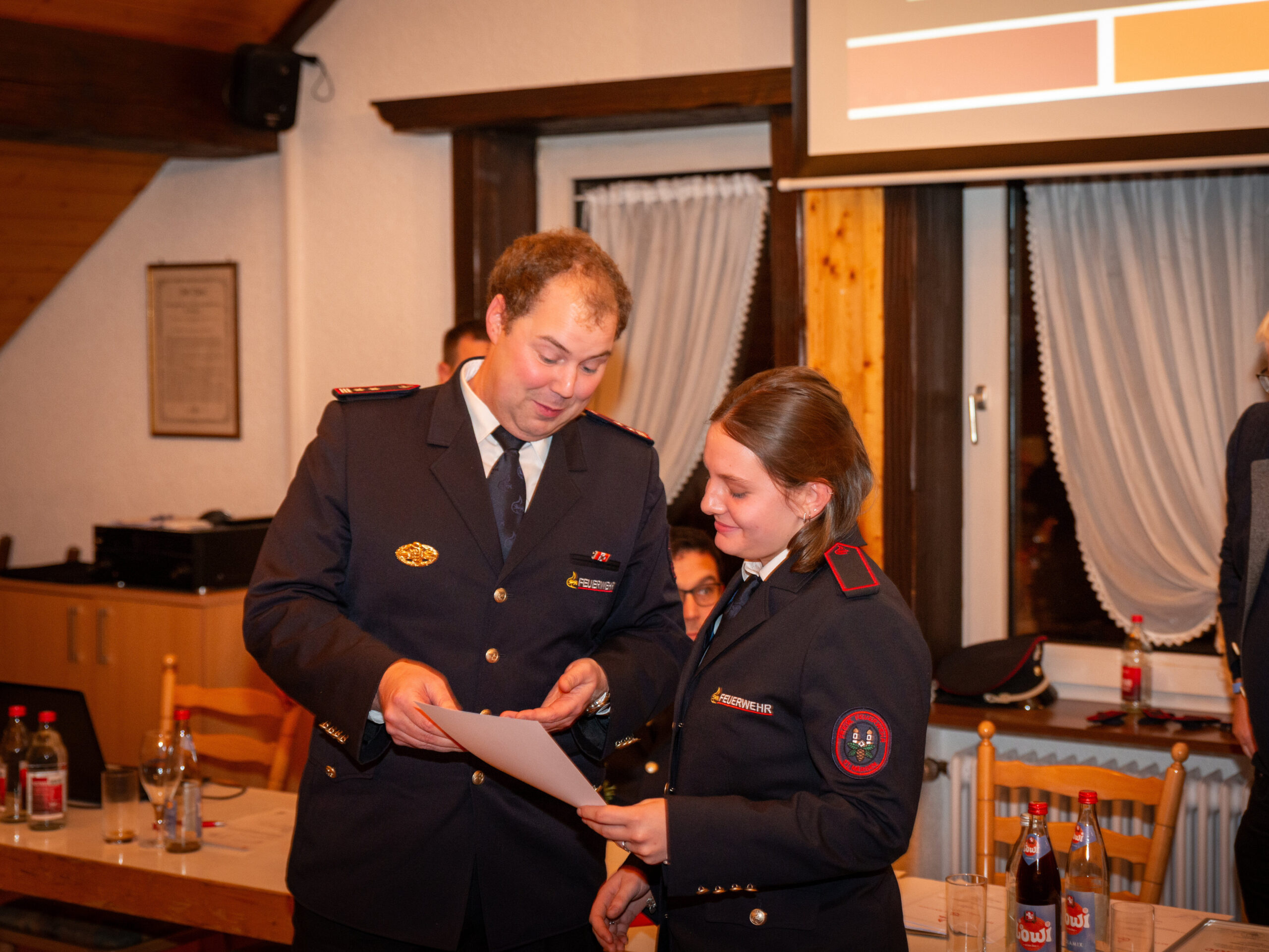Befördert wurde Florian Simon zum Löschmeister. Zum/Zur Oberfeuerwehrmann/-frau befördert wurden Cora Schuler, Simon Wehrle und Robert Wehrle. Weiter wurden Benjamin Hog und Leonie Schuler zum/zur Feuerwehrmann/-frau befördert.